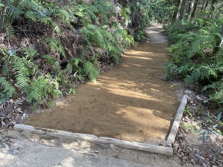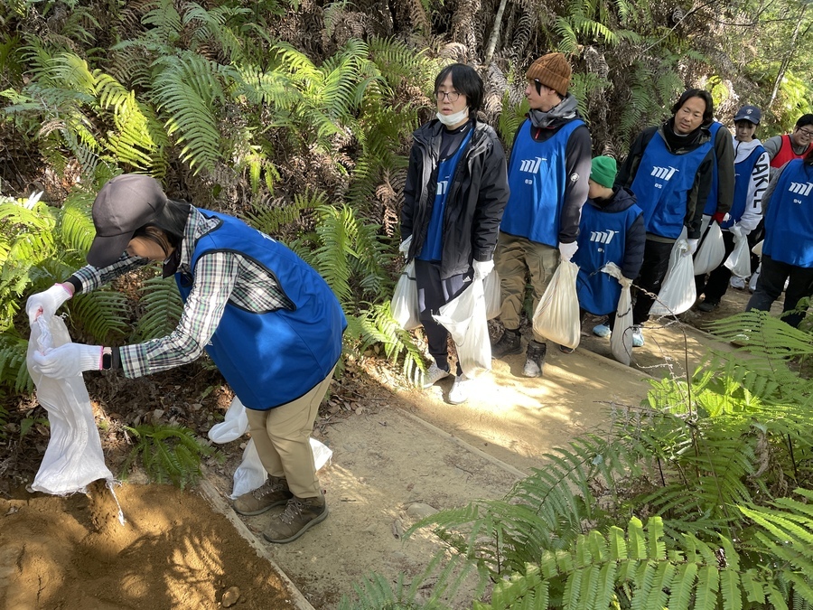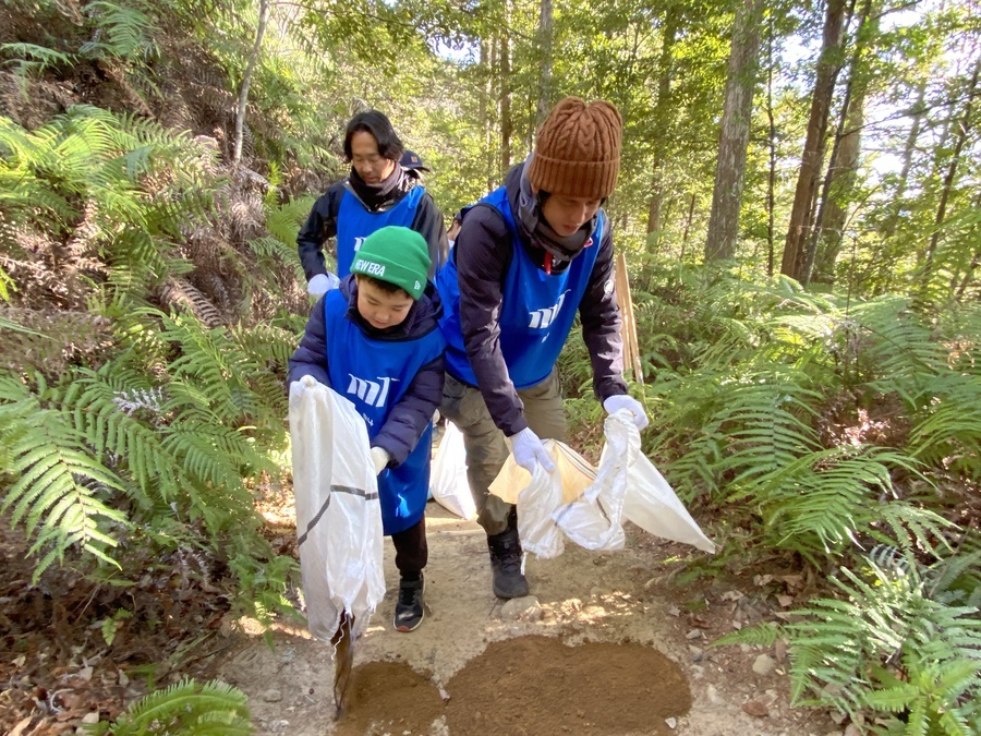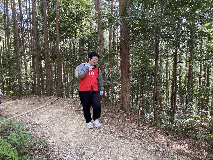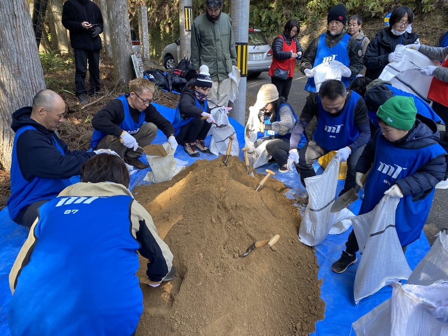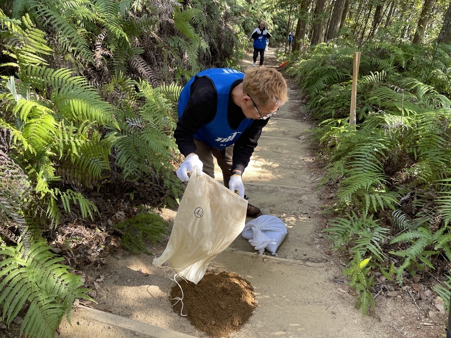 参加者の皆様は、発心門王子から熊野本宮大社までの約7㎞のコースをトレッキングし、土置き場に設定してある三軒茶屋跡で一度集合し、世界遺産センター職員から作業説明をさせていただいてからスタートしました。初めに土嚢袋に土を入れて約200m伏拝王子跡に向かったところに土を入れました。5往復以上運んでいただいた方もいらっしゃいました。凄まじいスピードの方や一回で大量の土を入れて運ばれていた方、そして小学三年生の子が一生懸命運ばれている姿が印象に残っています。
