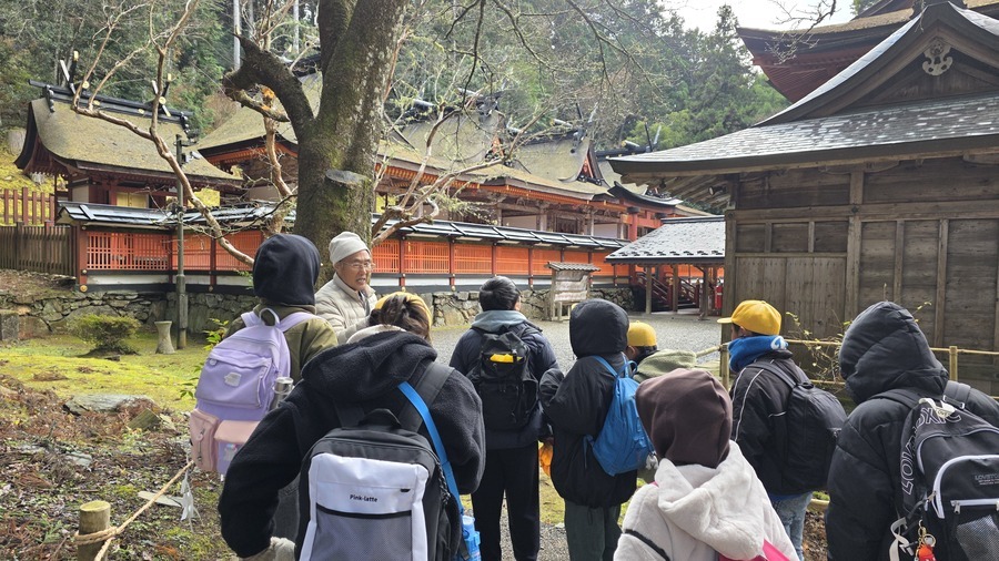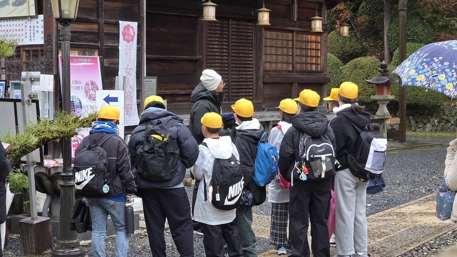 当日はここ最近では一番寒い気温で高野山内では雪が降っている中での現地学習となりました。初めに柿の郷くどやま道の駅で世界遺産マスターと合流し1日の流れ等の説明を受けました。その後、慈尊院、丹生官省符神社から勝利寺に行き、丹生都比売神社に車で移動しました。高野山と深い関係があることをマスターから聞き、初めて知る内容も多かったと思います。地元にこのような素晴らしい場所があることを誇りに感じてほしいと思いました。