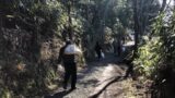 作業箇所は、三軒茶屋跡から伏拝王子跡に向かって約150mのところで行い、土の量は1tでした。何往復もしていただき約1時間で終えることができました。作業の最後には土固め作業もしていただきました。初めて使う道具だったようで終始笑顔で交代交代に記念に写真を撮りながら土を固めていただきました。