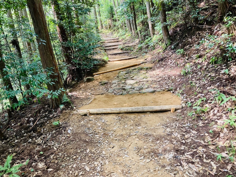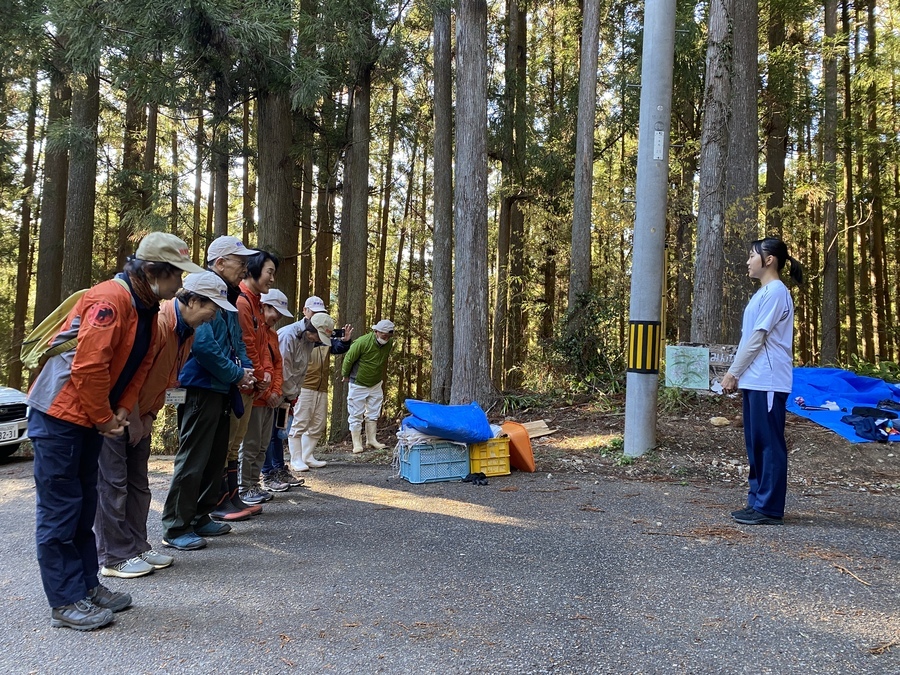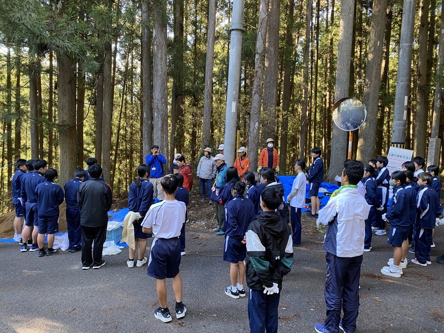 初めに本宮中学校で道普請活動の目的と意義について話しました。地元にある世界遺産を保全していくことの大切さを感じていただけたなら嬉しいです。その後、バスで三軒茶屋跡まで移動し世界遺産センター職員から今回作業をする場所などについて説明を受けました。道普請箇所は、伏拝王子に向かって50mのところで土の量は3tでした。
