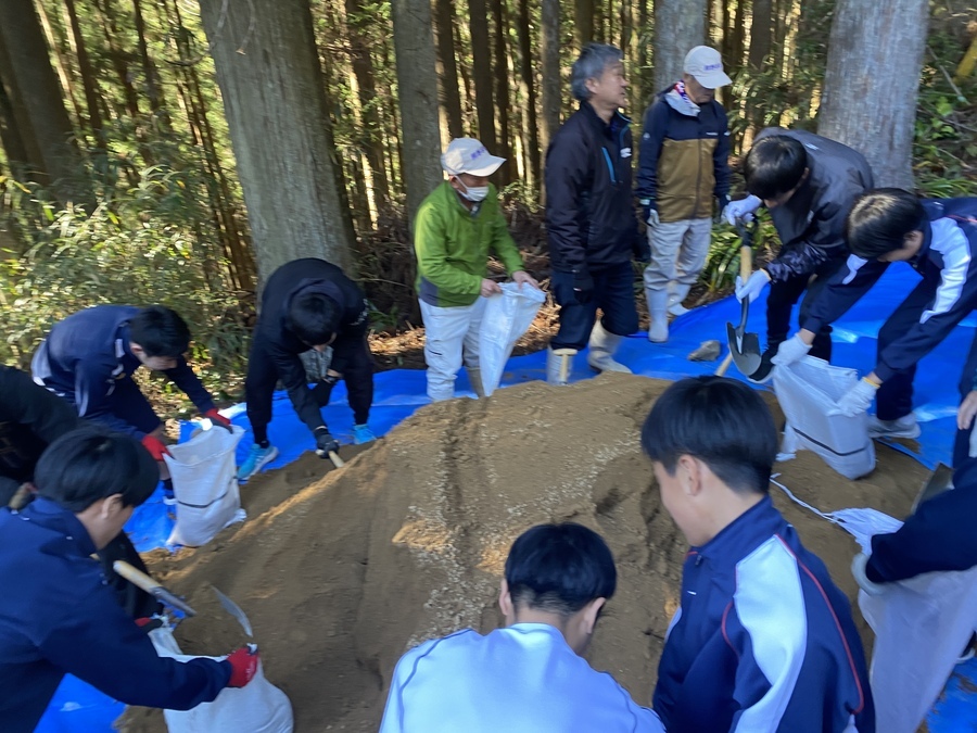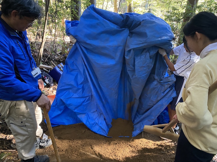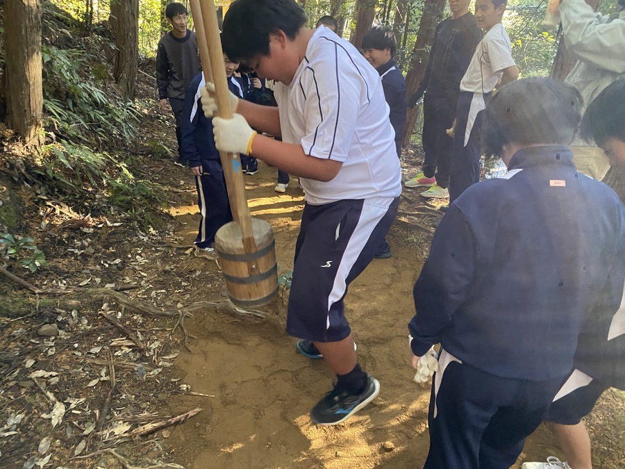 生徒の皆さんの一回で運ぶ土の量が多く、びっくりしました。引率の先生も生徒とコミュニケーションを取りながら競うように土をたくさん入れている姿をみて生徒との関係性が築かれていると思いました。約1時間はかかると思っていましたが土を運ぶ距離が短かったことと生徒の皆さんの頑張りのおかげで約30分で終了することが出来ました。土固めも皆さんに体験していただき、道普請の一連の流れを知る機会となりました。