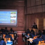 当日は、台風の接近により悪天候のため、予定していた伏拝王子から熊野本宮大社までの約5.0㎞をフィールドにした「学びウォーク」が実施できず熊野本宮大社/旧社地大斎原の散策に変更しなければならなくなりました。一方、世界遺産入門学習では、世界遺産センター職員が世界遺産の概要ついて講義を行うとともに世界遺産「紀伊山地の霊場と参詣道」についての歴史的背景等について視聴覚教材を活用した学習指導を実施いたしました。