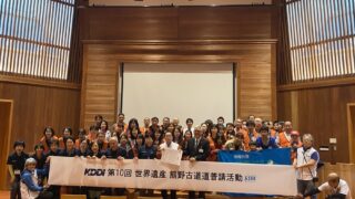KDDI株式会社様は、今回で10回目の道普請となり60名の皆様にご参加いただきました。大阪を朝早くに出発され、昼前に世界遺産熊野本宮館に到着されました。その後、多目的ホールにて開会式を行いました。関西総支社長である江口様の挨拶では、平成23年より道普請を行い、昨年までで累計660名の方とともに活動に取り組んできたという話をされました。改めて大勢の方々に支えられて道普請活動ができていることに感謝の気...