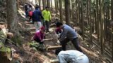 2011.04.17自然環境保全プロジェクト「いつか来た道」 (17).jpg平成23年4月17日(日)、さわかみ一般財団法人の皆さんが「熊野古道・中辺路(大門王子付近)」の道普請を行いました。当日は14名が参加し、田辺市教委・センター職員の指導の下、土入れや横断講・側溝に堆積した土砂をかき出しました。約5時間もの長時間にわたる作業でしたが、皆さんは笑顔を絶やすことなく熱心に取り組んでいました。2月に続いて2回目の道普請であり、11月には3回目のご協力を頂く予定です。