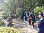 郷土の優れた歴史や自然、先人たちの努力や工夫を学び、郷土に対する誇りや豊かな情緒を育むことに取り組んでいる県立串本古座高等学校串本校舎の1・2年生29名が参加されました。まず、生徒の皆さんに移植ごて(小スコップ)を持ってもらい、古道を歩きながら横断溝の掃除を行ってもらいました。横断溝は古道に流れる雨水を谷に逃がし、古道の表土を守る大切な役目があります。次に祓殿王子跡近くの袖摺坂で道普請を行いました。その後の世界遺産学習と合わせ、先人たちが努力し守ってきた郷土や参詣道だから世界遺産として認められ、これからも守り続けていく努力が必要なことを感じていただきました。