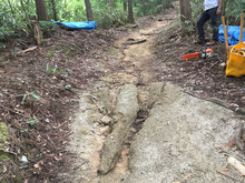 作業箇所は、40町石から坂を少し上がったところでした。雨水により土が削られ傷んでいる所に、約1tの土を補充し、整地していただきました。