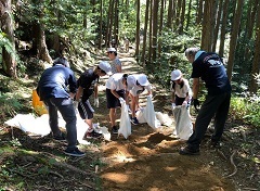 今回の道普請は、次世代育成事業の一環として行いました。午前中は世界遺産「紀伊山地の霊場と参詣道」についての学習をし、午後からは和歌山県世界遺産マスターの方にご案内いただきながら三軒茶屋跡から熊野本宮大社間を歩き、現地学習を行いました。現地学習の中で道普請を行いました。
