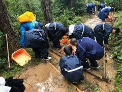 今回の道普請は、次世代育成事業の一環として行いました。午前中は世界遺産「紀伊山地の霊場と参詣道」についての学習をし、午後からは和歌山県世界遺産マスターの方にご案内いただきながら三軒茶屋跡から熊野本宮大社間を歩き、現地学習を行いました。現地学習の中で道普請を行いました。