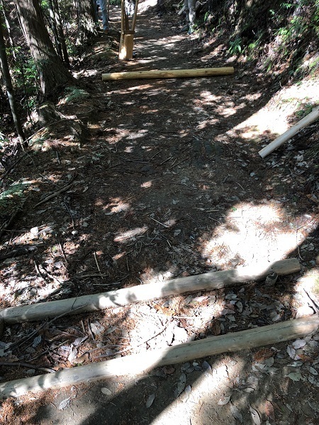 道普請ウォークは、式水から熊野本宮大社間を歩き、その途中、伏拝にて道普請を行いました。伏拝王子跡に到着後、道普請についての説明を聞き、作業を開始しました。作業内容は、雨水により土が流れてしまった箇所への土入れ及び整地作業でした。土の補充箇所は、土置き場から約80mの場所でした。みなさんどんどんと土を運んでくれ、1トンの土を15分もかからず運び終えていました。補充したところは、たこで整地していただきました。また足踏みでも固めていただき、しっかりと土がしまっていました。作業終了後には、みんなで直した道の上で記念写真を撮っていました。