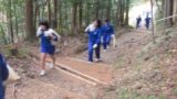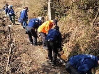 参加された皆様方は、杭や掛矢、鋤簾、ピックなどの資材や道具を手に持ち、町石道の矢立から笠木峠までを歩かれました。その後、87町石付近にて道普請を行いました。同クラブの皆様方は、この箇所の道普請に何年も前から継続して取り組んでおられます。今回も側溝の整備作業をしていただきました。参詣道上に雨水が流れ込まないよう、溝にたまった落ち葉や枯れ枝を取り、溝をきれいにしていただきました。昨年度の作業と比べると非常に暖かく、活動するには気持のよい天気でした。