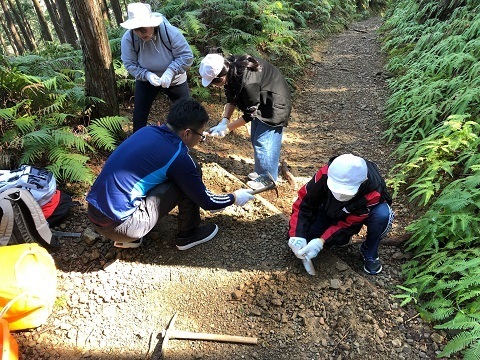 溝に詰まった土や石、枯れ枝、落ち葉を取り除く作業をしていただきました。道標66から67の間の約500mの区間の溝をすべてきれいにしました。横断溝が20か所以上あり、それに加え側溝もありましたので、かなりの作業量になりましたが、児童の皆さんは熊手やピックを使って最後まで一生懸命作業をがんばってくれました。