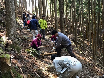 参詣道の急坂の部分には、土の流出を防ぐために横木を設置しているところがあります。この横木は、ちょうど階段の役目も果たしています。三越峠付近の参詣道では、既存の横木やそれを固定するための杭がだいぶ朽ちてきていたので、新しいものに交換していただきました。横木を設置し、固定するための杭を打ち、さらに横木がぐらつかないように石や土を入れ、踏み固めました。全部で約40段分の横木を交換していただきました。