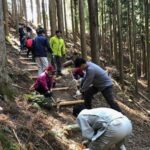 道普請の前に、まず三軒茶屋跡から祓殿まで熊野参詣道を歩かれました。祓殿に着くと、道普請についての説明を聞いていただき、作業が始まりました。土置き場から土の補充箇所までは約100m。26名の皆様で約1トンの土を運んでいただきました。土を入れたところは、たこで突き固めていただきました。