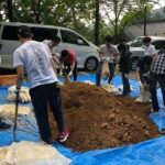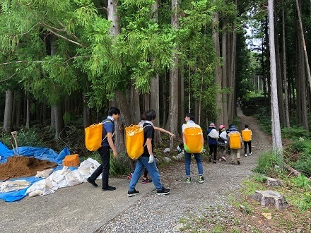 祓殿の土置き場に到着すると、道普請の作業について説明を聞いていただき、道普請を開始しました。ご用意いただいた土は1トン。土置き場から土の補充箇所までは、約200m。12名の皆様で何度も往復し、無事すべての土を補充することができました。土を補充したところは、たこでしっかりと突き固めていただきました。