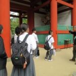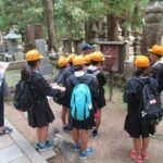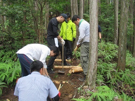 今回の作業内容は、雨水による参詣道の土の流出を防ぐための横木の整備作業でした。参詣道を歩かれる方にとっては階段にもなり、安全に歩けるようになります。作業に使用する資材を全員で運び、2グループに分かれて作業を開始しました。杭を半分に割る作業、杭を打ち込む作業、石や土を入れ固める作業等、一日かけて作業を行っていただきました。今回もハードな作業内容でした。全部で62本分の横木を整備していただきました。