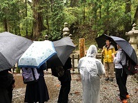 雨中の奥之院もなかなか風情があるものです。現地に立ってその果てしない夢に思いを馳せることで、巨人空海も多少は身近に感じられるのではないでしょうか。時折激しくなる雨にも負けず、皆さん最後まで元気よく歩いてくださいました。