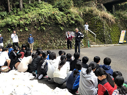 道普請の作業後は、和歌山県世界遺産マスターの方々の案内のもと、参詣道ウォークを行いました。自分たちが入れた土のところを踏みしめながら、熊野本宮大社を目指し歩きました。
