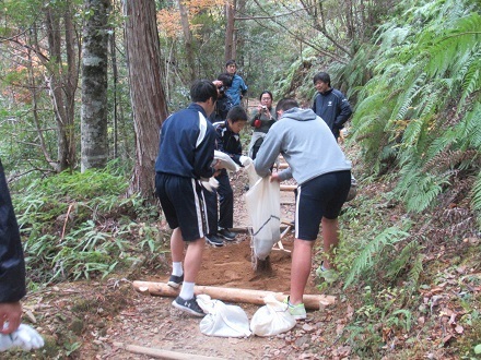 田辺市立本宮中学校のみなさんに、熊野参詣道中辺路(三軒茶屋)で道普請を行っていただきました。
