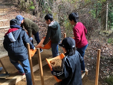 40町石付近の土置き場に集まり、作業についての説明を聞いた後、作業を開始しました。手箕への土入れ、補充箇所までの土の運搬、補充箇所での整地という3つの作業を交代しながら行いました。みんないっぱい作業をやりたくて仕方ない様子。とても生き生きと活動していました。約1トンあった土があっという間に補充されていきました。土を入れたところは、たこやタンパーで突いたり足で踏み固めたりして、しっかりと締めてくれました。また、土の補充・整地作業だけでなく、参詣道の上や溝の所にたまった落ち葉をかき出す清掃作業も、一生懸命にしてくれました。