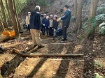 同校は昨年度から、卒業記念活動として古道整備に取り組んでいます。そのことで、日頃の学習に世界遺産をテーマに設定したり、最近では小雲取越も歩き世界遺産の価値を学習したとのことでした。この日は、発心門王子から水呑王子、式水茶屋、伏拝王子、三軒茶屋、祓殿王子、熊野本宮大社まで約7km間の古道ウォークを楽しみました。その途中、式水茶屋跡、伏拝王子跡周辺で側溝掃除(道普請)を行いました。時々見られた土に埋もれた溝、落ち葉が想像以上に積もった溝に驚きの表情を見せながらも、根気よく頑張ってくれました。これからもこの経験を生かし、世界遺産の保全に取り組んでくれることを心より期待します。