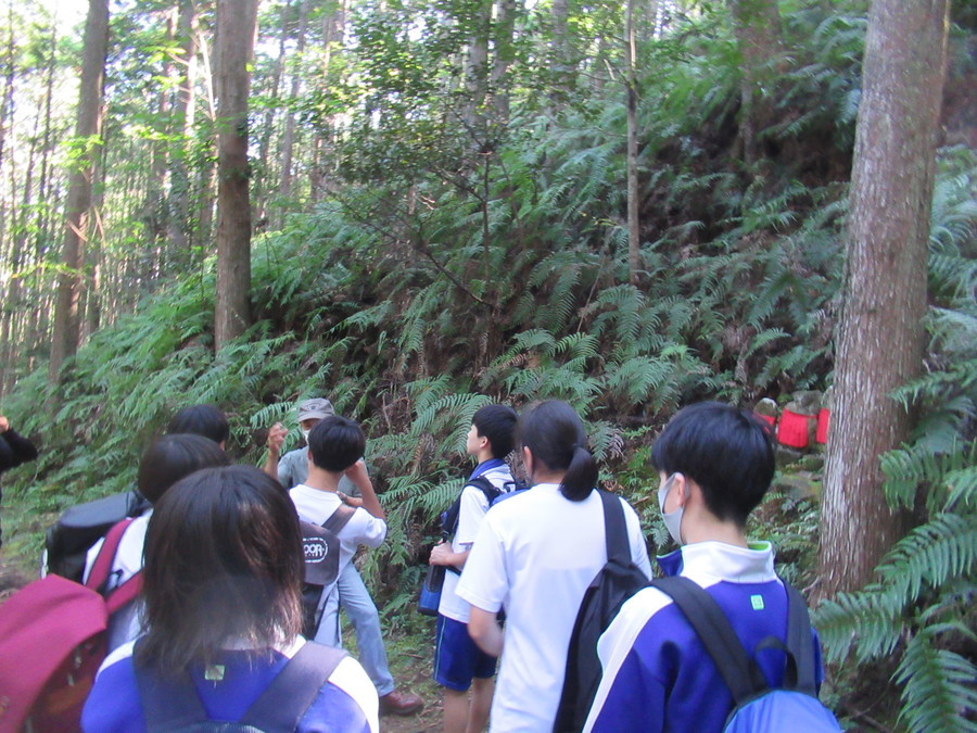 熊野本宮館で世界遺産講座を受け、世界遺産の概要、「紀伊山地の霊場と参詣道」の世界遺産としての価値などについて学んだ後、世界遺産マスターさんの案内により三軒茶屋跡から熊野本宮大社までを現地学習のコースとして歩きました。現地学習では、かつては参詣道沿いの植生が異なっていたこと、杉や檜が生活のために植林されていたことなど、インターネットなどからではなかなか得難い知識を得て、生徒さんたちの表情が大きく変わっていくのが印象的でした。