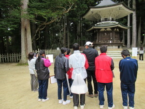 高野町中央公民館で世界遺産講座を受け、世界遺産の概要、「紀伊山地の霊場と参詣道」の世界遺産としての価値などについて学んだ後、世界遺産マスターさんの案内により壇上伽藍から金剛峯寺に至り、バスで移動後、中の橋から弘法大師御廟までを現地学習のコースとして歩きました。現地学習では、中門の四天王の像の意味や、奥の院で五輪塔が宇宙を表していることなどの説明を聞き「高野山には何度も来たことがあるけれど、初めて知ったことがたくさんあった」と発見の喜びに相好を崩す生徒もいました。