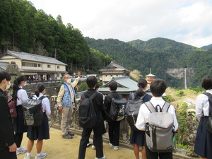 那智勝浦町教育センターで世界遺産講座を受け、世界遺産の概要、「紀伊山地の霊場と参詣道」の価値などについて学んだ後、世界遺産マスターさんの案内により大門坂から参詣道を通って那智山青岸渡寺・那智大社に行き、その後那智大滝に至るまでのコースを現地学習として歩きました。事前によく調べてきていたのでしょう、不明な点があれば礼儀正しくマスターさんに質問していました。また、実際に那智の滝の絶景を目の当たりにして、感嘆の声を上げる生徒もいました。