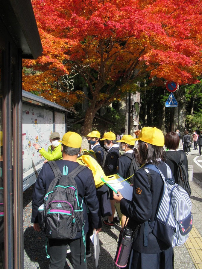 今年度はこの時期が紅葉の見ごろで、美しく色づいた木々に囲まれた奥の院を児童たちは歩いていきました。マスターさんが立ち止まって説明すると、メモを取りながら熱心に耳を傾けていました。