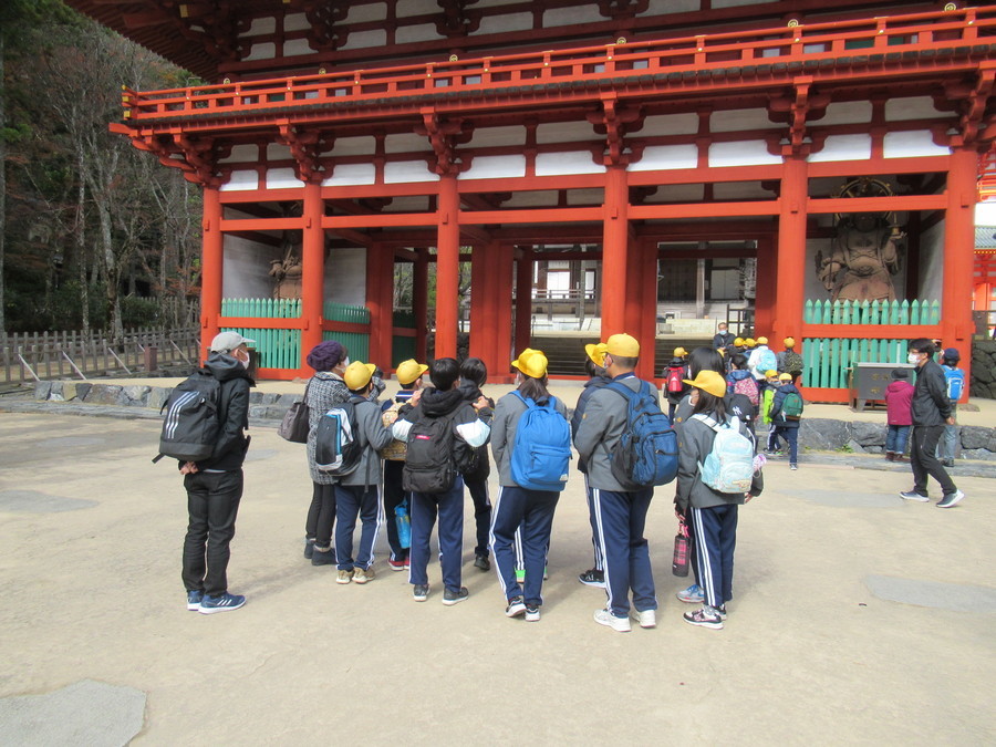 高野町中央公民館で世界遺産講座を受け、世界遺産の概要、「紀伊山地の霊場と参詣道」の世界遺産としての価値などについて学んだ後、世界遺産マスターさんの案内により、午前中は壇上伽藍から金剛峯寺へと至る現地学習を行ないました。午後は転軸山の道普請に参加しました。