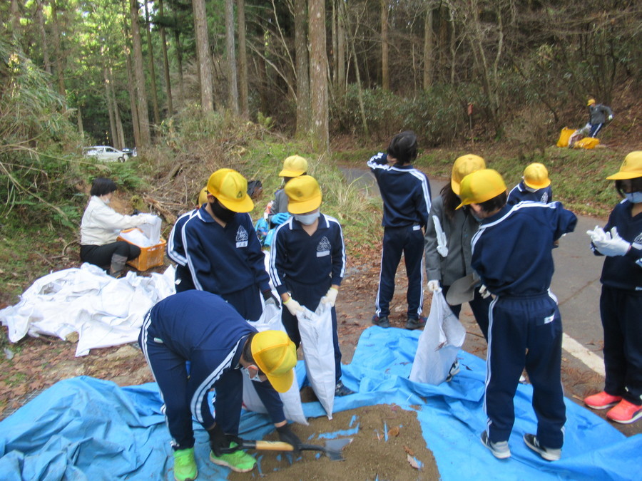 午後からの道普請は新鮮な経験だったようで、重そうな土嚢袋も進んで運び、あっという間に予定していた土入れを完成させてしまいました。次世代育成事業は、世界遺産の価値を学び、次世代へ伝えていこうとする気持ちをもつきっかけとなることを願うものですが、楽しそうに道普請に取り組む児童を見て、世界遺産の保全を担うのはやはりこの子たちだという思いを筆者は新たにしました。
