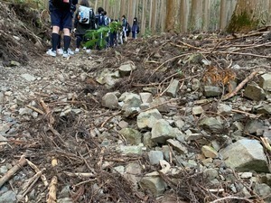 仏坂は、大辺路では唯一舟でわたる熊野古道です。生徒たちは、安居の渡し保存会の川船で安居の渡しを体験しました。船を降りると、仏とは名ばかりの急峻な坂道が待っています。生徒たちは、古道を整備するため落石、折枝を取除き、落葉を清掃して歩行導線を確保する道普請に努めました。今回の道普請は、短い時間でしたが、「楽しかった」「やりがいを感じた」等、ポジティブな感想が多く聞かれました。生徒たちには、この経験を生かし今後も世界遺産の保護に関心を持ち、道普請の担い手に育っていただけたらうれしく思います。