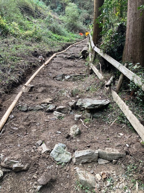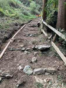 和歌山市民図書館は2020年に開館した複合施設キーノ和歌山と連結した近代的な施設です。この日は、同館事業に応募された方々の道普請で、筆捨松周辺の古道整備を行いました。整備は主に水道(みずみち)の整備で、地道な作業に皆さん懸命に取組みました。このような企画を立案いただきました同館ご担当者様並びにご参加の皆様方に心よりお礼申し上げます。
