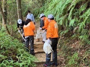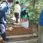 同社の道普請参加は今回で4度目です。同社からは参加のたびに道路整整備道具を寄贈いただいています。今回もタンパ4本をいただきました。有効に使ってまいりたいと思います。今回の作業は、道普請ですっかりお馴染みになった三軒茶屋跡です。この道は元和5(1619)年水野重仲が新宮領主となったおりかつての御幸道を改修したとされます。参加者は事前に分担された作業を機敏な動作で次々にこなしていきました。表土が丁寧に整地された古道は、江戸時代初期の整備を彷彿させます。今後共熊野古道をよろしくお願いいたします。