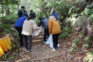和歌山県職員労働組合の皆さんの道普請は、高野山転軸山に引き続き今年2回目です。今回は舞台を熊野古道に移し、三軒茶屋跡での道普請となりました。作業箇所まで古の参詣者に思いを馳せつつ、古道分岐にあたる三軒茶屋モニュメントから伏拝王子へ200m程歩きます。古道の傷みは、道を遡ると手が付けられていないことから洗堀が増していくようです。参加者は、土を詰めた土嚢袋を両手に洗堀された箇所へ何回も何回も繰返し運んでいくと、傷んでいた表層面が往時にかえっていくようです。県職員労働組合の皆さんは、参加者全員わいわいと作業を楽しみながらこなしていきます。仕上がりも滑らかで来訪者の身になって道普請が行われていることがわかります。来年もどうぞよろしくお願いいたします。![]()