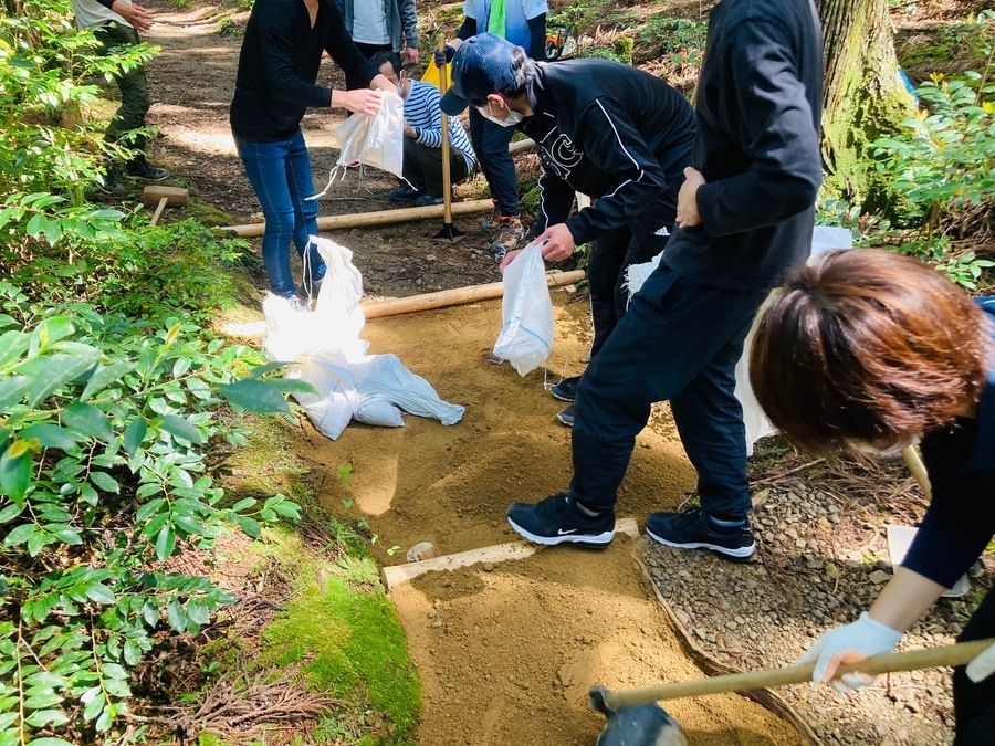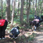 熊野古道の道普請は、保存管理の中で交通関連遺跡と呼ばれ、国内法令上通行者の安全及び路面の保存のため必要な行為とされており、日常的維持管理として取り扱われます。今回の道普請箇所はなじみの式水茶屋跡でしたが、いつもより100m程度上った道標66番付近の作業だったので参加者にはかなりしんどかったと思います。しかし、この厳しさが研修効果をアップさせるのに役立ったと好評をいただきました。これからも、御社の研修充実のため、また世界遺産の保全のため熊野にお越しいただきたいと思います。