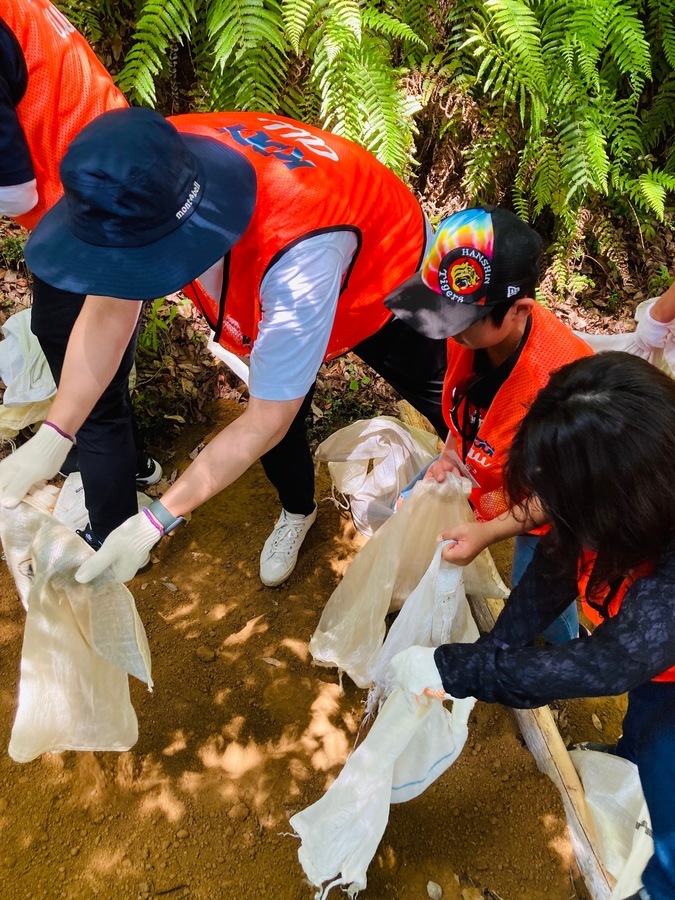 三軒茶屋はこれまで多くの皆様に普請いただいたことにより、往時の姿に戻りつつあります。戻りつつあるとは、道幅、路盤等が確保され、スロープ状にできるのではないかと考えます。本来は石が敷かれていたのでしょうが、路床を真砂土(渋土)で戻し、仕上げとして山土で覆い転圧をかけてやります。同社の皆様は、今回も2トンの真砂土で洗堀箇所を元のレベルまで戻しにいきました。道普請は所謂土木作業ではありません。参加の皆様は、往時に思いを馳せながら一人ひとりの力で古道の復元のため普請に努められました。本当に有難く感謝の気持ちしかありません。今後共、世界遺産紀伊山地の保全をよろしくお願いいたします。