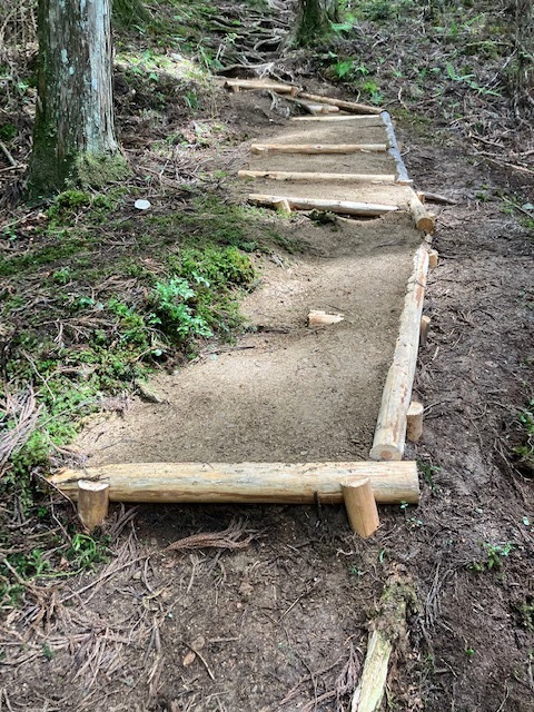 NHKグループ有志18名の皆さんは、転軸山の登り口の道普請に取り組みました。転軸山は昨年度から道普請に取り組み始めたところです。同山は楊柳山、摩尼山と併せて高野三山と呼ばれ、かつて女性の立ち入りを禁じていた高野山の名残の地でもあります。2016年世界遺産に女人道として追加登録されたことで有名です。有志の皆さんは、狭小かつ急坂で離合できない道を譲りあったり、脇道を通り抜けたりしながら作業を続けました。完成した古道は全体的に土が補充され、よい補修ができたと思います。本日、保全が施されたこの道を、私たちはいつまでも大切に守って行かなければなりません。これからも皆様には、古道に足をお運びいただき道普請に勤しんでいただければ幸いに思います。