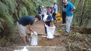 Kumano Trekの皆様は2回目の道普請で、18名の方が三軒茶屋跡付近で取り組みました。天候は曇りでしたが、気温がさほど上がらなかったため、道普請はやりやすく、参加者の方々も心地よい汗を流していらっしゃいました。