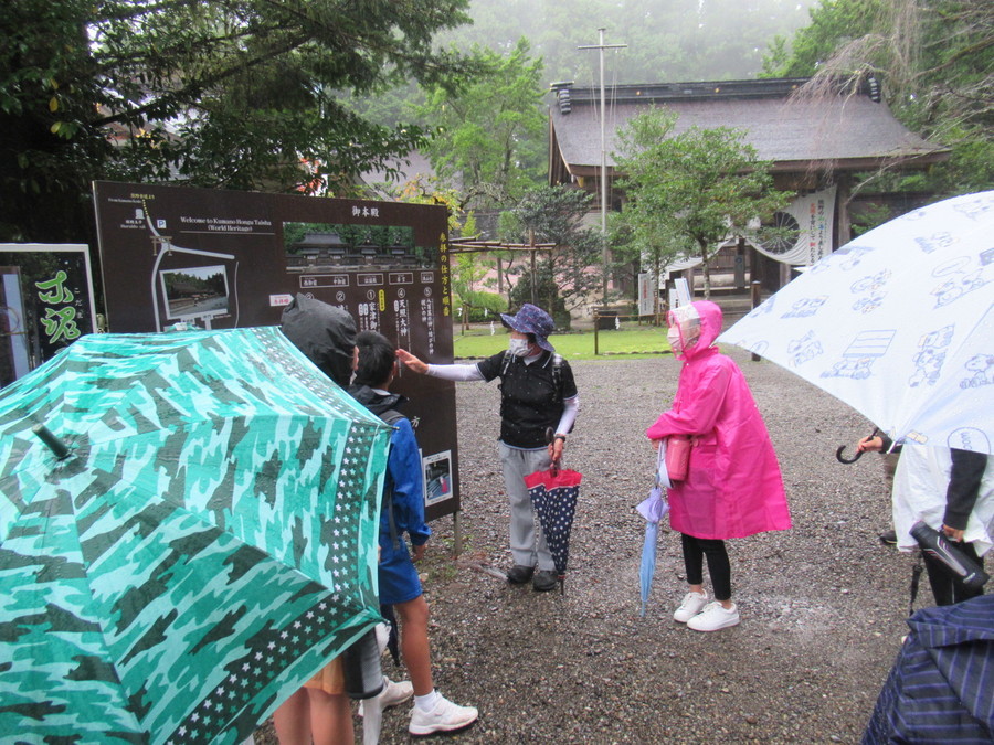 世界遺産熊野本宮館で世界遺産入門講座を受けたのち、外はあいにくの雨だったため、本宮大社と大斎原までを歩く現地学習を行いました。