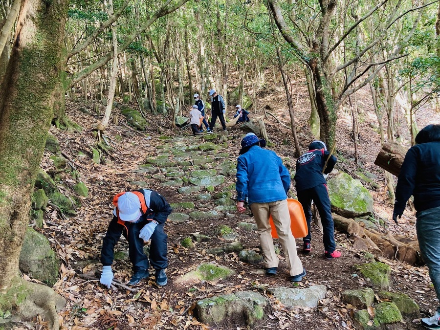 学校で世界遺産講座を実施後、妙法山阿弥陀寺に移動して、かけぬけ道に入り、21町から19町あたりの清掃活動を行いました。30分ほどでしたが、児童たちが熱心に活動してくれたおかげで、見違えるようにきれいな古道になりました。その後、誇らしげに古道を後にしていく児童たちの姿が印象的でした。
