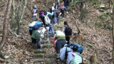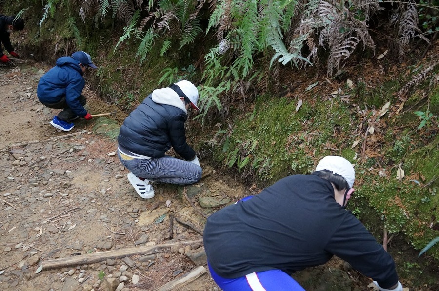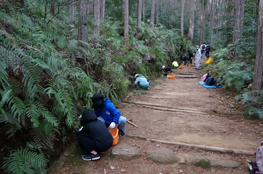 同校は卒業記念活動として古道整備に取り組んでいます。この日は、発心門王子から熊野本宮大社まで約7km間の古道ウォークを楽しみ、その途中、74番道標付近で側溝掃除(道普請)を行いました。側溝に堆積している土や落ち葉を用具や手を用いて取り除く作業ですが、普段行うことのない新鮮な体験に楽しそうな面持ちで取り組んでいました。これからもこの経験を生かし、世界遺産の保全に取り組んでくれることを心より期待しています。