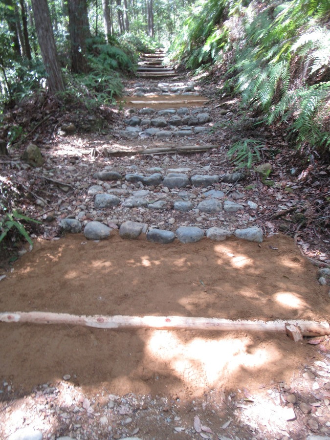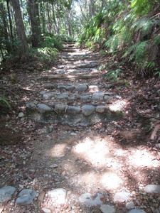今回の土の量は1トンでした。所々、水たまりが残っているところがあり、足元が悪い状態ではありましたが、協力しながら整備をすることができました。1時間程の活動で道も写真で確認できるように綺麗な姿に変わりました。これも21名の参加者の方々の協力があってこそです。土を何往復も運ぶ作業では、お互いに声を掛け合い、励ましあっておられる姿が印象的でした。当日は、熊野古道を歩かれる外国人観光客の方々も多く、すれ違う度に笑顔で「thank you」と声を掛けていただき、参加者の皆様も自然と笑みがこぼれ、また、土を固める作業では、交互に記念に写真を撮られるなど楽しみながら取り組んでくださいました。