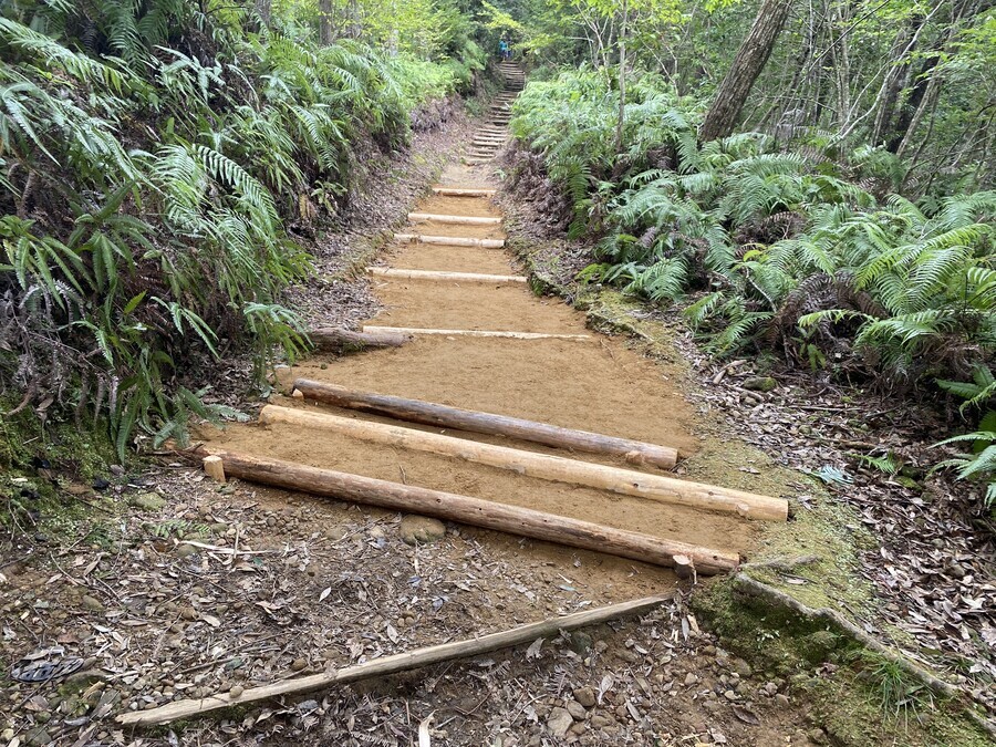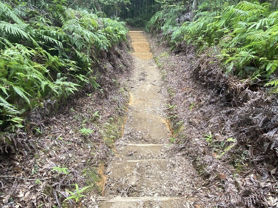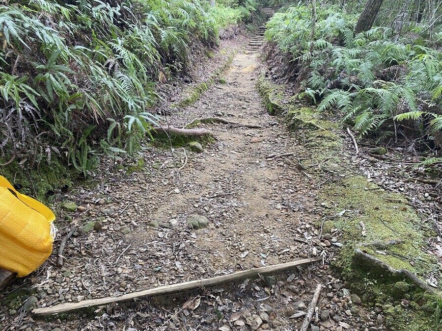 普段から、訓練をされている方々なので、一回で運ぶ土の量がとても多くびっくりしました。土を入れた土嚢袋を3〜4個、リュックサックに入れて、多く運んだ方で10回近く運ばれていました。私自身も途中から土を運びましたがついていくのに必死でした。普段の道普請よりも土の量が多かったこともあり、6箇所に土を補充することができました。