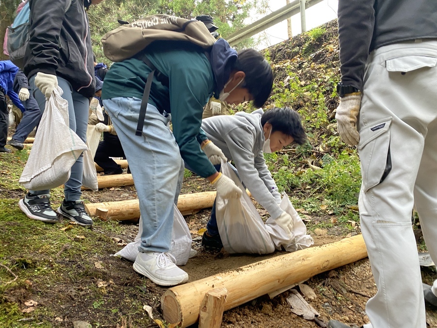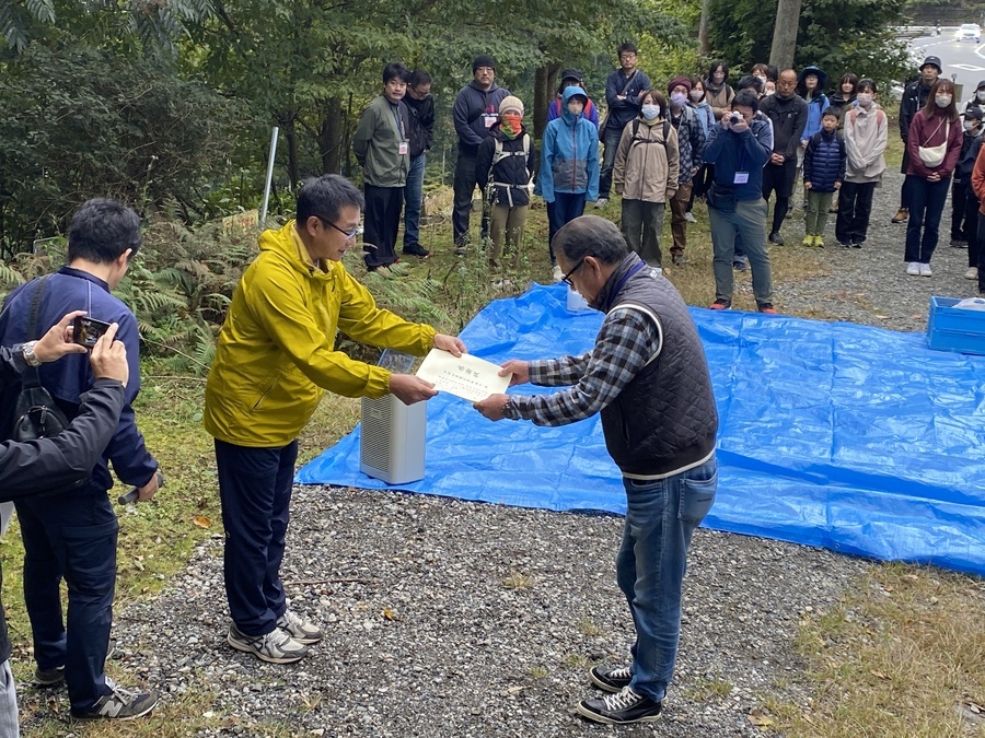 初めに、40町石付近に集合し開会式を行われ。世界遺産センターから、10回目の道普請参加を記念して感謝状をお贈りしました。曇り空でしたが、雨が降ることもなく、涼しい中での土運び作業になったので気持ちよくできたのではないでしょうか。ご家族での参加もあり、小学生から高校生の子供たちにも活動していただけたことはとても良かったと思います。土の補充箇所として準備した7箇所全てに土が入り、良い状態に戻すことができました。その後、大門まで町石道を歩かれ、午後は高野山を観光されたそうです。高野山内の木々も少しずつ色づいており秋の高野山を楽しむことができたのではないでしょうか。