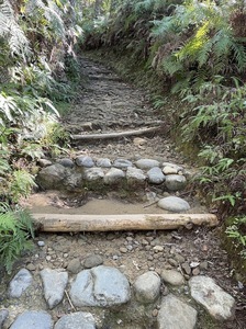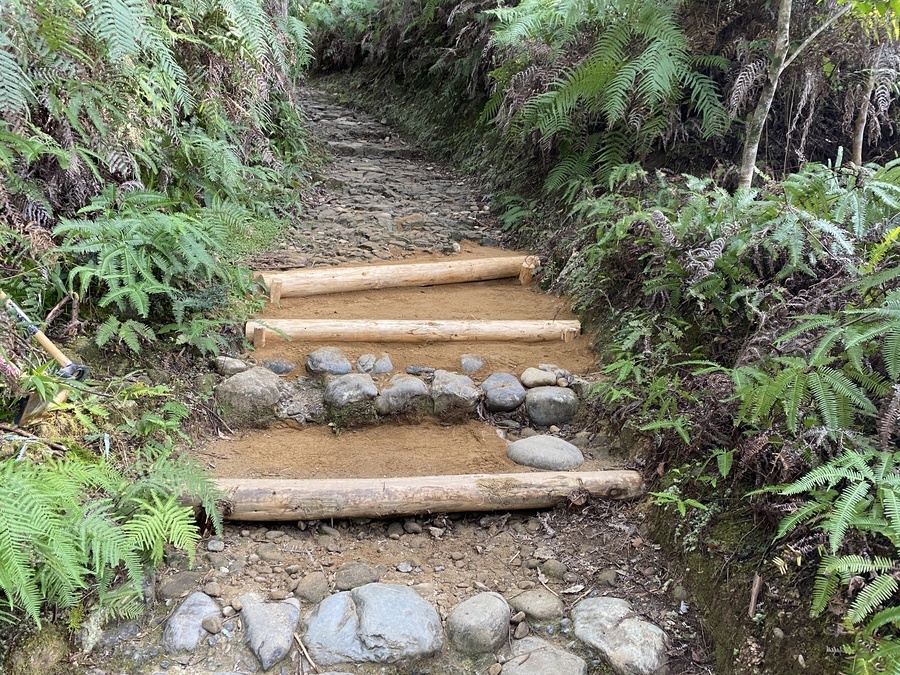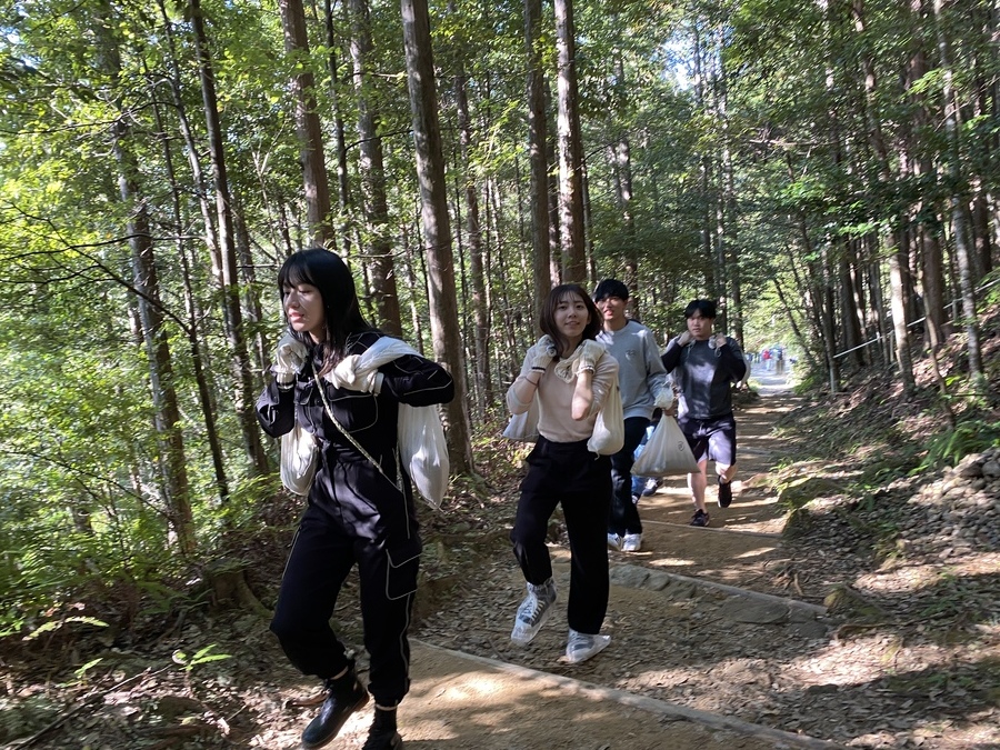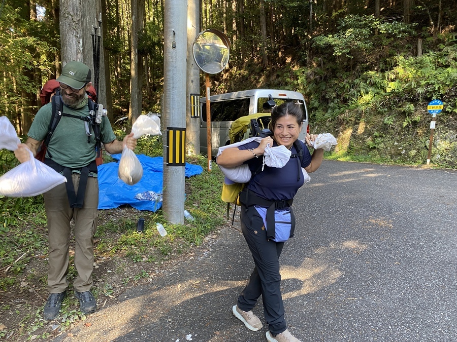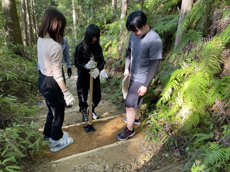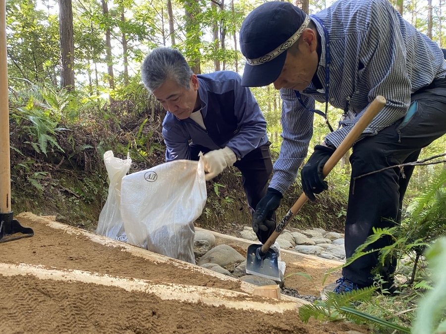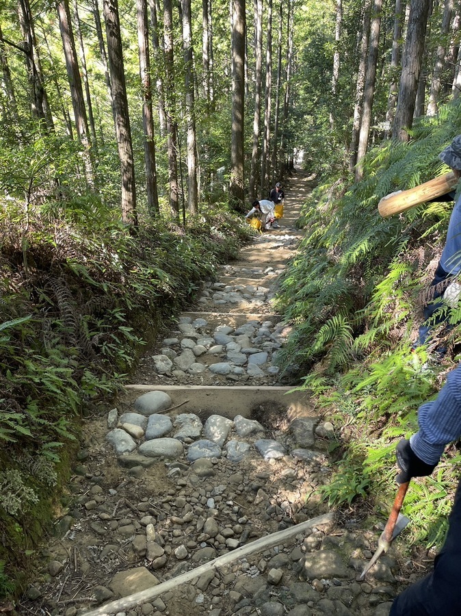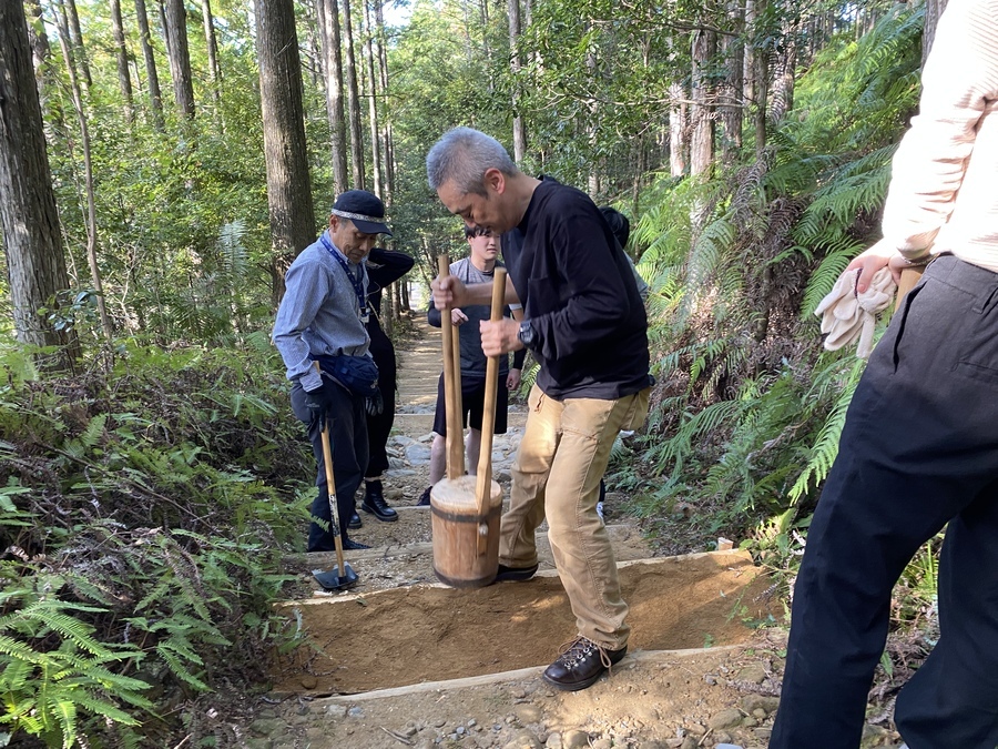 その後、道普請箇所に移動し道普請についてレクチャーを行った後、活動を開始しました。人数が少なかったこともあり、1人辺り5〜6往復の土を運んでいただきました。新入社員の方が多いとのことで、足取りも軽く、笑顔で活動されていたのが印象的でした。途中、外国人観光客の方から、「道普請を手伝いたい」と声をかけていただき、一緒にすることになりました。自ら声をかけて協力していただける姿に感動しました。こういった形で国際交流ができるのも道普請の魅力だと思います。土入れ終了後は補充した土を固める作業を行っていただけました。参加者7人の関係性がよく、楽しみながら固める姿は見ていてとても良かったです。翌日は、語り部と一緒に、発心門王子から熊野本宮大社に向けて歩かれたそうです。昨日の道普請の箇所を通られた時、どのように感じられたでしょうか。