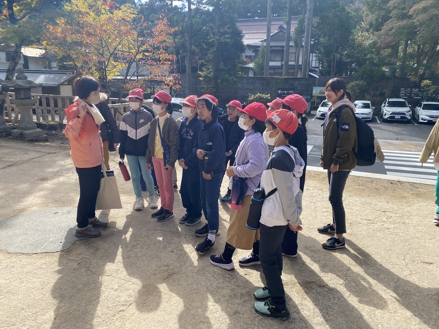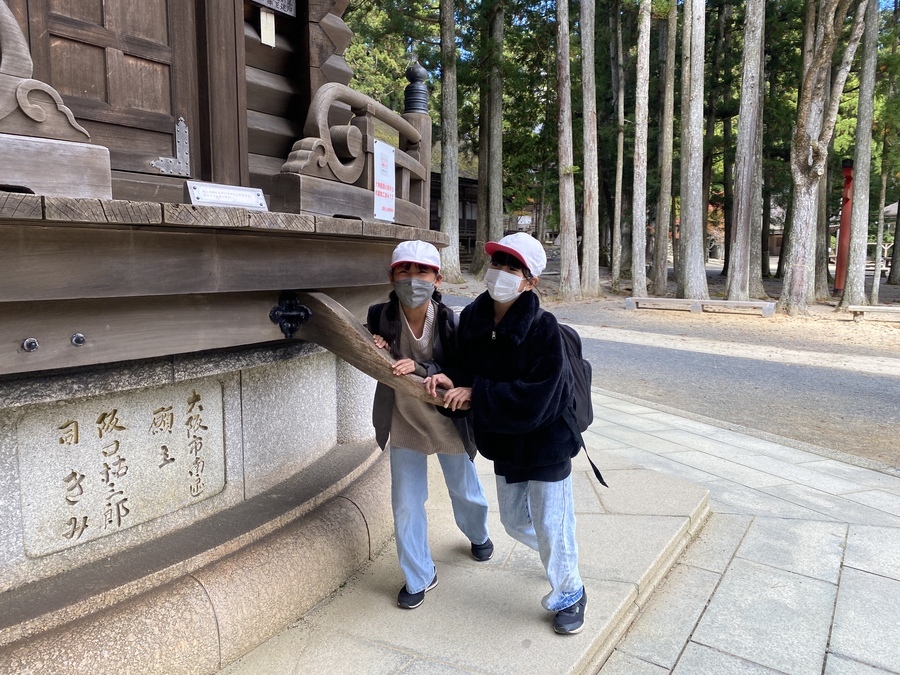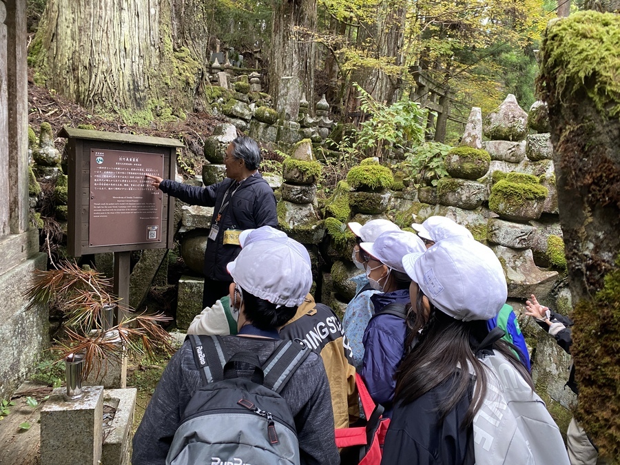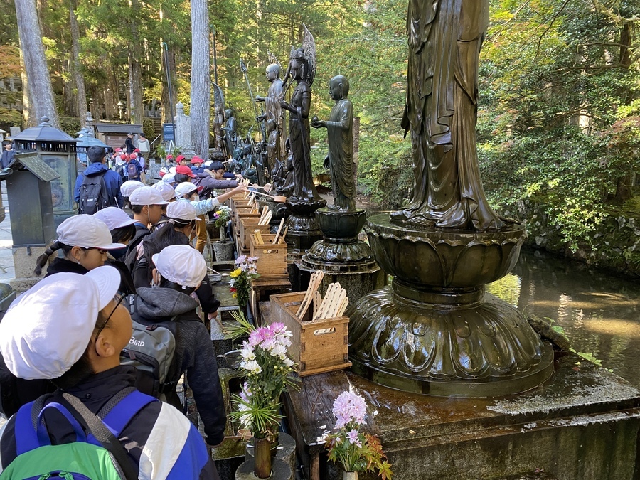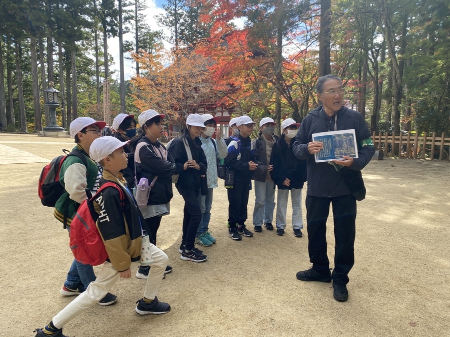 和歌山市立楠見小学校5年生81名の児童の皆さんが次世代育成事業に参加していただきました。10月12日(木)に事前授業を行っていたので今回は現地学習を行いました。場所は高野山でした。6班に分かれて世界遺産マスターの皆様に現地説明を行っていただきました。午前中は、壇上伽藍、金剛峯寺を周りました。壇上伽藍中門が昭和元年に火事で燃えたことや、和歌山県にある国宝の半分以上が高野山にあることなどを教えていただき、真剣な眼差しで話を聞いている姿が印象的でした。マスターさんからの質問に対しても的確に答えを言っている児童が多く、私自身もはっとさせられました。昼食後、歩いて一の橋から弘法大師御廟までマスターさんの説明を聞きながら学習を行いました。お墓がたくさんあることに驚いている児童や、何か雰囲気があるといっている児童がいて体全身で高野山を感じていたように思います。学校の社会科ではまだ歴史を学習していないのにも関わらず多くの戦国武将等が口々に出ていて驚かされました。午後の現地学習も充実したものになり良かったと思います。