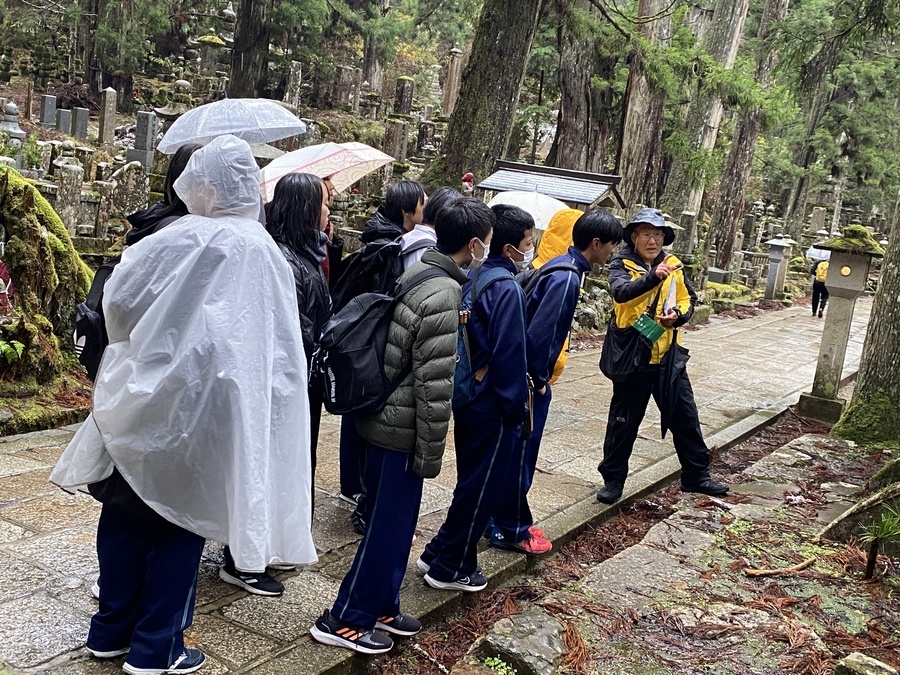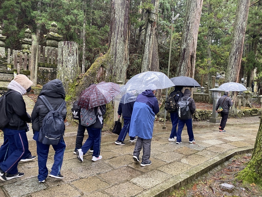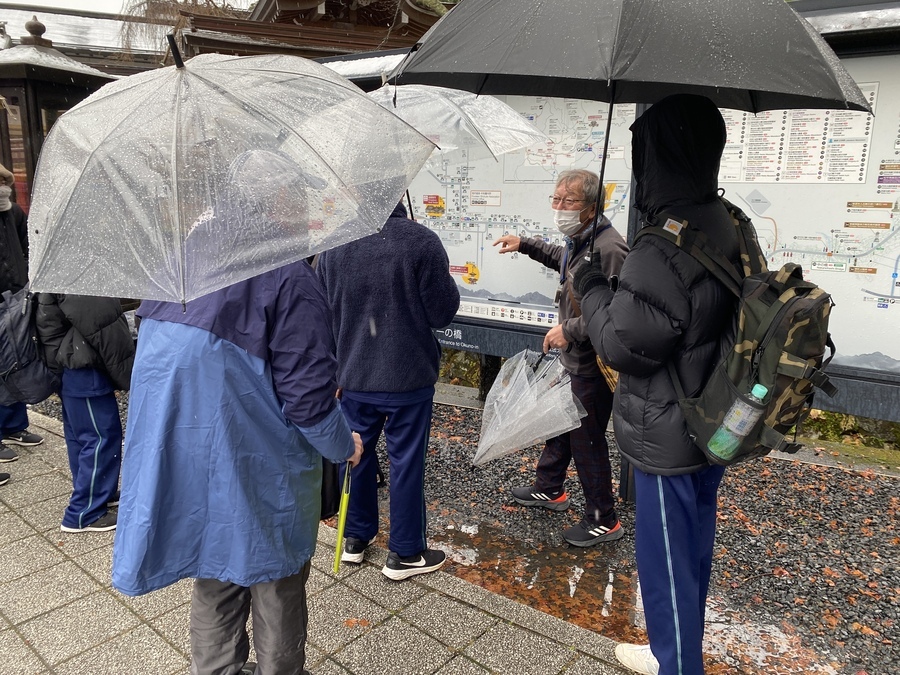 高野町中央公民館に到着後、世界遺産入門講座を行いました。初めは、緊張からか発言が少なかったですが、少しずつ発表してくれたので良い時間となりました。「紀伊山地の霊場と参詣道」に理解を深めるきっかけとなり、今後の学習に活かしてもらえると嬉しいです。昼食後、世界遺産マスターの皆さんと合流し、一の橋〜弘法大師御廟の現地学習を行いました。紅葉と寺院の雪化粧の共演が見事で生徒の皆さんも感動していました。寒い中ではありましたが、奥の院にある重要文化財の話をしっかりと聞いたり、マスターさんが出される歴史クイズに的確に答えたりと学びを深めることができたと思います。
