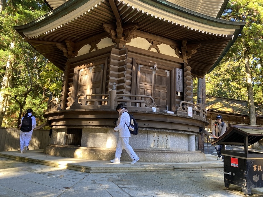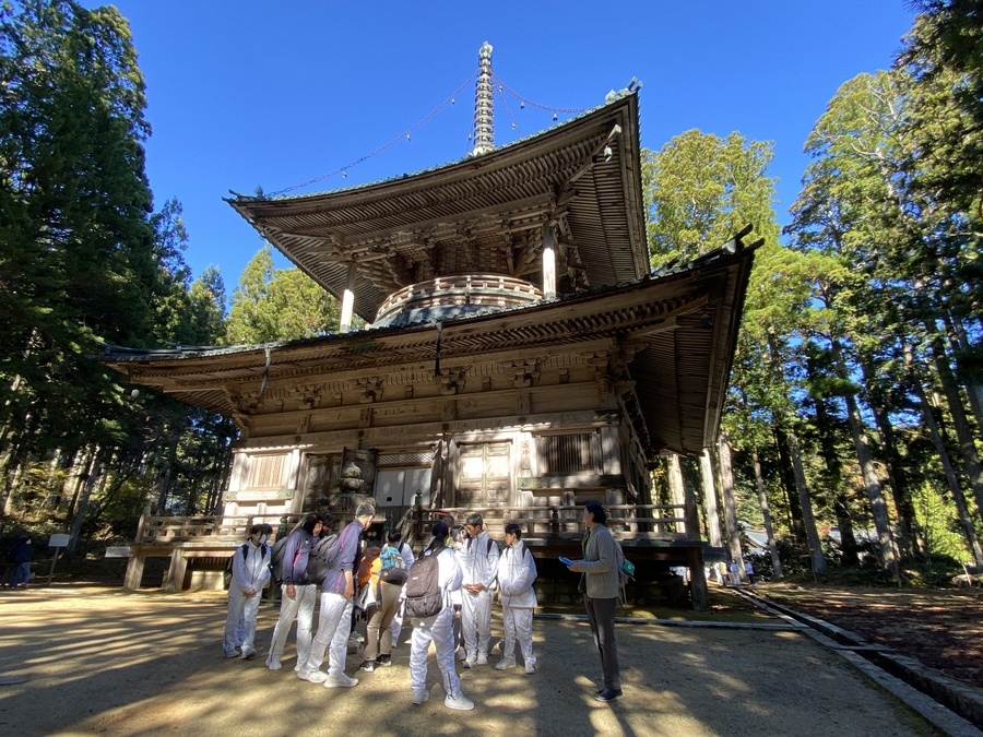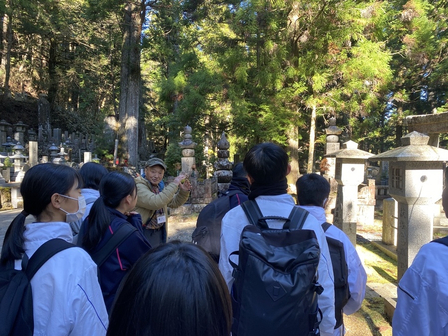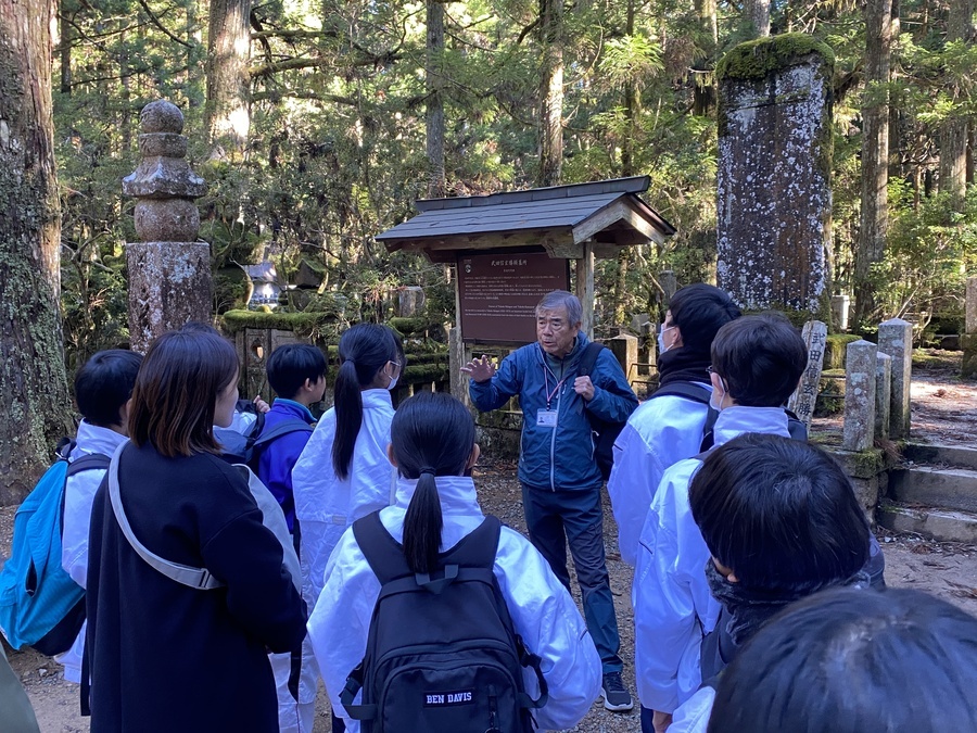 田辺市立上芳養中学校全校生徒44名が次世代育成事業にご参加いただきました。11月10日(金)に事前授業を行なっていましたので、今回は高野山での現地学習のみとなりました。世界遺産マスターと合流をしてから4つのグループに分かれて現地学習をスタートしました。午前中は、壇上伽藍~金剛峯寺のコースでした。中門からスタートし、六角経蔵、根本大塔などの説明をしていただきました。生徒の皆さんも積極的に参加している姿が見受けられました。「おっ」と驚くような知識を持っている方もいてマスターさんも驚いていました。約1時間で午前中の学習を終えて、午後からは一の橋~弘法大師御廟のコースでした。各グループの生徒とマスターさんとの間のやり取りもスムーズで2時間という行程の中、しっかりと話を聞き、マスターさんの質問に一生懸命答えている姿が印象的でした。歴史の勉強で習っている戦国武将や、五輪塔についてなど、初めて習う内容がたくさんあり貴重な時間となりました。