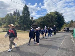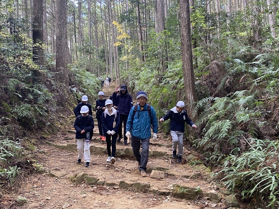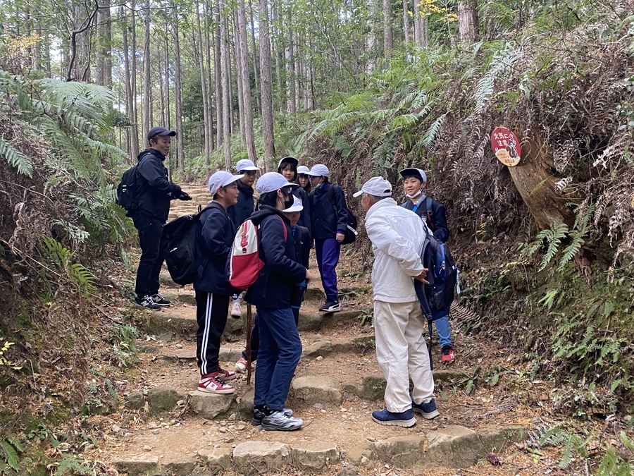 午前中は、熊野本宮館多目的ホールで世界遺産入門講座を受講いただきました。素直で積極的な発言や反応をしてくれたので楽しい学びの時間になりました。熊野三山の話や、顕著な普遍的価値などの話は忘れないでいてくれたらなと思います。昼食後、移動し伏拝口バス停〜熊野本宮大社の現地学習を行いました。そこでマスターさんと合流して5班に分かれてスタートしました。初めて歩く方も多かったので、熊野古道について学びながら楽しく歩かれていました。マスターさんからは、針葉樹と広葉樹の話や、王子社の話、熊野本宮大社についてなど色々なお話をしていただきました。普段歩かない距離を歩いたので、最後の方は少し疲れた表情もありましたが、一方ですっきりした顔の子供たちもいて良かったと思います。今日学んだことを今後の事後学習で更に深め、今回歩いた古道以外の道にも目を向けてほしいと思います。本日はありがとうございました。