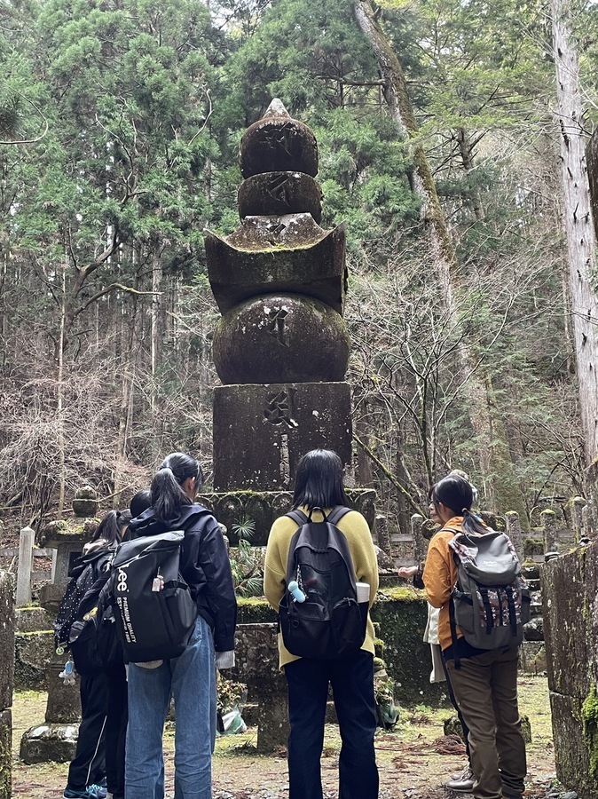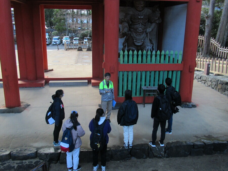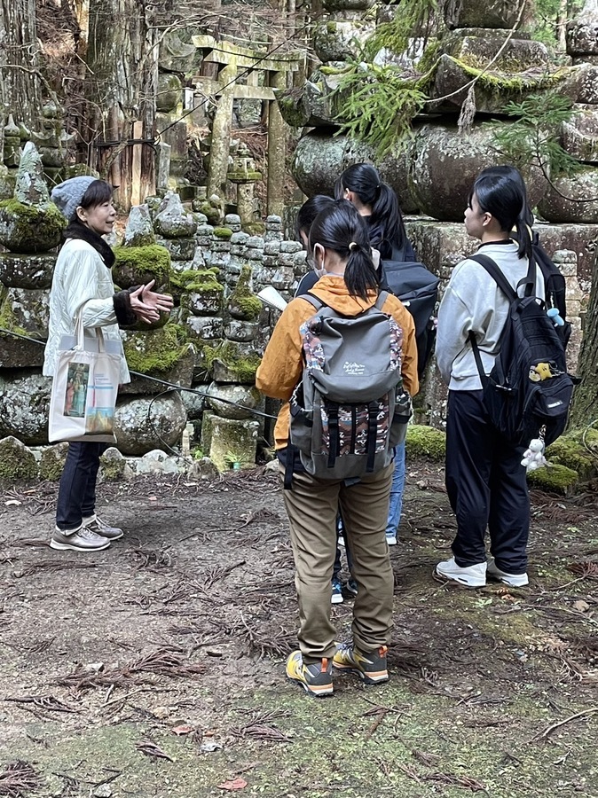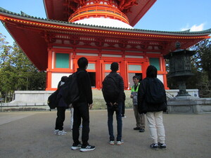 田辺高等学校11名の生徒の皆さんが次世代育成事業に参加いただきました。世界遺産マスターさんが「12月の高野山でこの暖かさは珍しい」というくらい穏やかな天候の中、事前に世界遺産入門講座を受講していただいていたので最初から、現地学習に取り組んでいただきました。2つの班に分かれ、午前中に壇上伽藍〜金剛峯寺、昼食後、一の橋〜弘法大師御廟間をマスターさんの説明により学習しました。1つの班が5、6名なので、マスターさんの説明も聞き取りやすかったようで、メモとペンを両手に持って興味深く学習する姿が印象的でした。巨木の下に何種類もの苔が群生する様子には感動した様子でした。